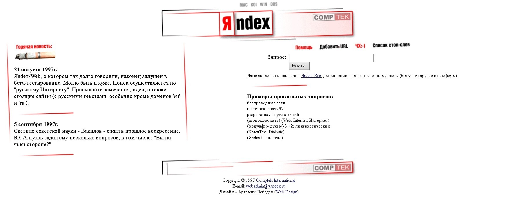 Впервые о поисковой системе узнали на выставке Softool в далеком 1997 году. Тогда страница называлась Яndex-Web и состояла из строки поиска, новостей и подсказками по пользованию новинкой. В качестве дизайнера главной страницы выступал Артемий Лебедев. Он сохранял данный пост до 2013 года.